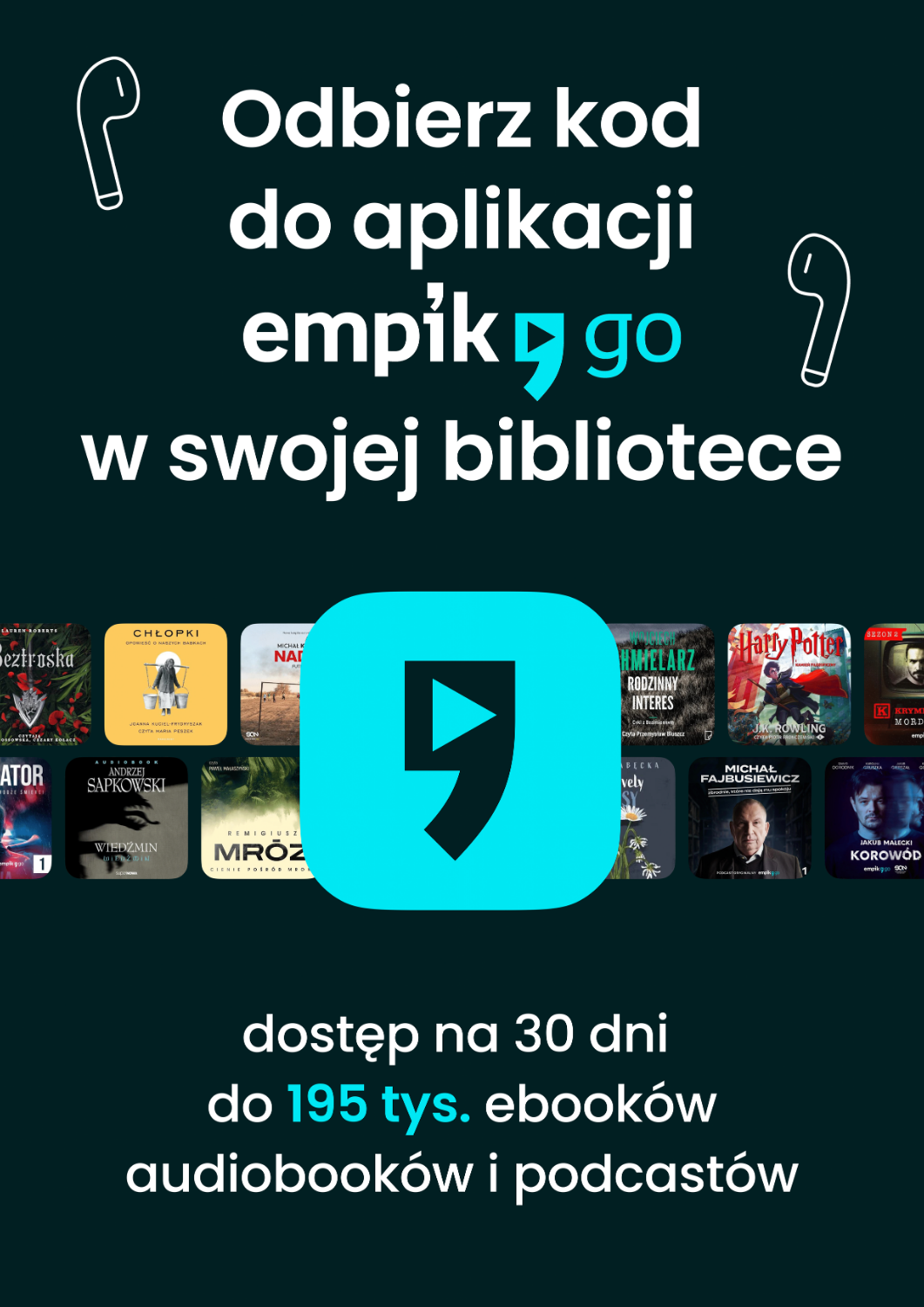 Empik Go dla czytelników bibliotek to dostęp do 195 tysięcy e-booków, audiobooków, podcastów, seriali oryginalnych w tym tytuły niedostępne w żadnej innej subskrypcji bibliotecznej. Czytanie i słuchanie bez limitu tytułów i stron. Wyjątkowa aplikacja dostępna na telefony, tablety, czytniki, Kindle tm (bez dopłat), Android Auto, CarPlay.
